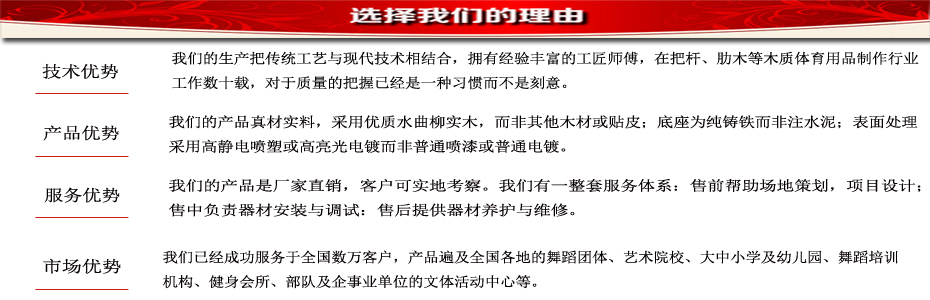 把桿是采用優(yōu)質(zhì)水曲柳木加工而成。水曲柳具有彈性、韌性好,耐磨,耐濕等特點。紋理直,花紋美麗,有光澤,硬度較大。把桿內(nèi)嵌彈簧鋼芯,極大增強了把桿的柔韌性、彈性和安全性,從而保證把桿練習(xí)者技術(shù)動作的充分發(fā)揮。 表面環(huán)保聚酯清漆處理,漆膜圓潤,手感細(xì)膩。