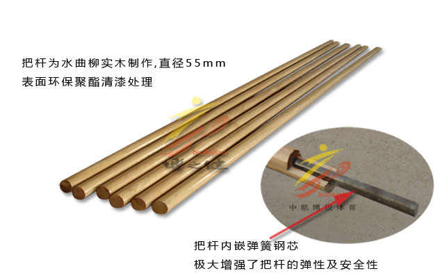把桿為水曲柳實木材質(zhì),把桿Φ55,內(nèi)有Φ22彈簧鋼,表面環(huán)保聚脂清漆處理.