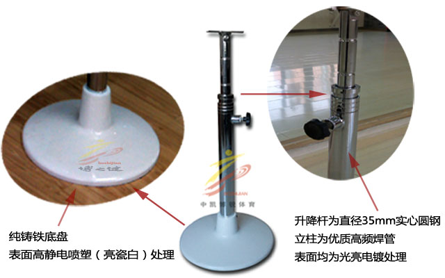 結(jié)合舞蹈訓(xùn)練的特性和把桿練習(xí)的實用性,把桿器材均采用科學(xué)的設(shè)計、優(yōu)質(zhì)的選材和先進(jìn)的生產(chǎn)加工工藝。為保證其穩(wěn)定性,底座采用純鑄鐵底盤,表面處理為高靜電噴塑。底座立柱采用直徑60mm高頻焊管,并設(shè)計有高度調(diào)節(jié)結(jié)構(gòu),升降桿采用直徑35mm實心圓鋼,表面處理為高亮光電鍍。
